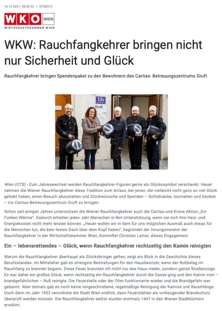 Vor drei Jahren riefen die Wiener Rauchfangkehrer ein Sicherheitspaket ins Leben, das Kohlenmonoxidunfälle verhindern soll. Seither findet im Rahmen der jährlichen Hauptkehrung auch eine Luftverbundprüfung statt. Die Aktion zeigt Wirkung: Die Kohlenmonoxidunfälle sanken bereits um 30%, die Zahl der Todesfälle sogar um 85%. Darüber hinaus stellten die Rauchfangkehrer 800 defekte Anlagen sicher und bewahrten so knapp 20.000 Wiener vor einer potenziellen Kohlenmonoxid-Vergiftung. Bei der jährlichen Überprüfung kontrollieren Rauchfangkehrer auch die Fluchtwege – aus gutem Grund. Innungsmeister Josef Reimar betont: ,,Freie Fluchtwege retten Leben!’’ Im Spätherbst starten die Wiener Rauchfangkehrer deshalb eine neue Sicherheitsaktion, um Bewohner zu sensibilisieren.